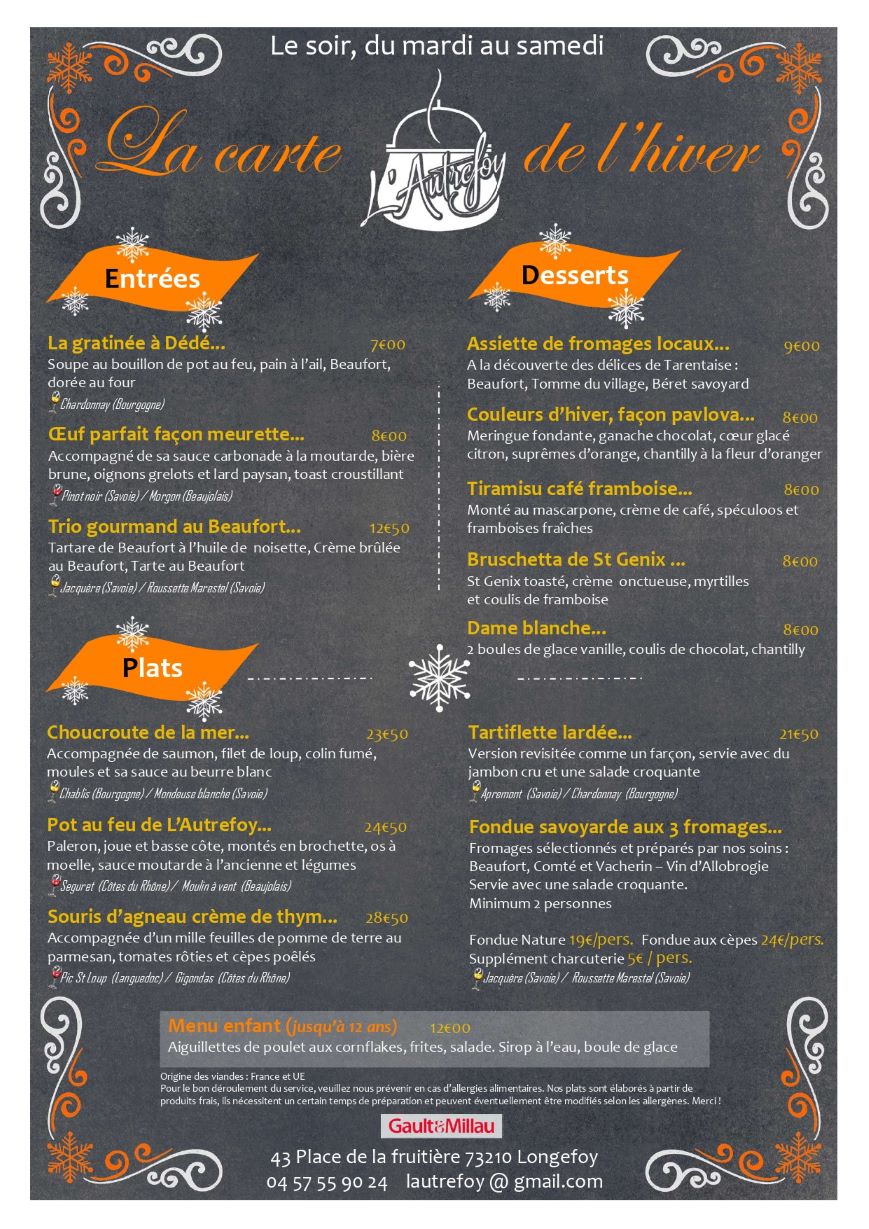 Horaires d’été : midi et soir, du mardi au samedi, dimanche midi. Horaires d’hiver : le soir, du mardi au samedi. Horaires d’intersaison : le midi, du mardi au dimanche et le soir, vendredi et samedi.